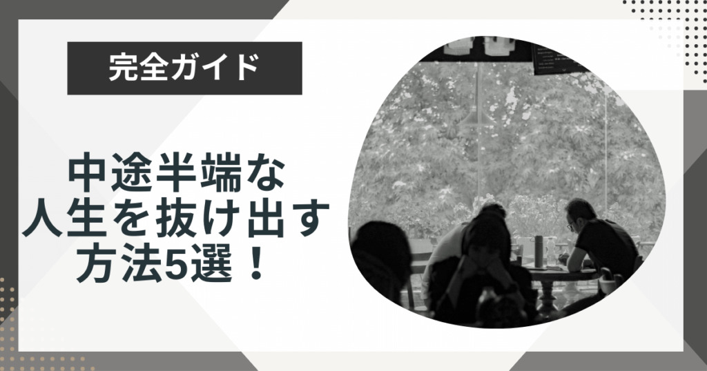 この記事のまとめ 中途半端な人生は抜け出せる...? 中途半端な人生を抜け出す方法を徹底解説 中途半端な人生を送っている…… 何をやっても中途半端で続かない…… 中途半端な自分が嫌い 何をやっても中途半端で終わってしまう。 毎日満たされず、苦しいです...