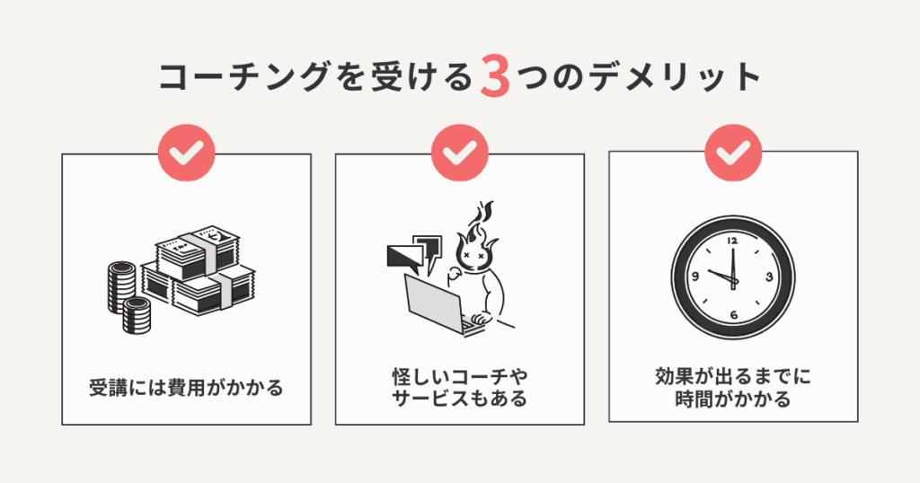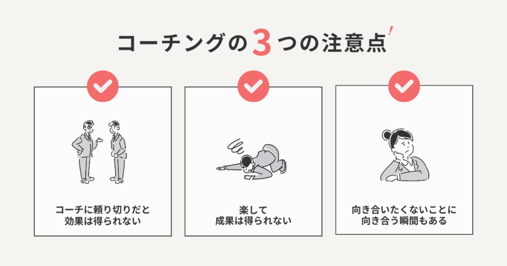 コーチングは効果が得られる一方で、受けるうえでの注意点が3つあります。