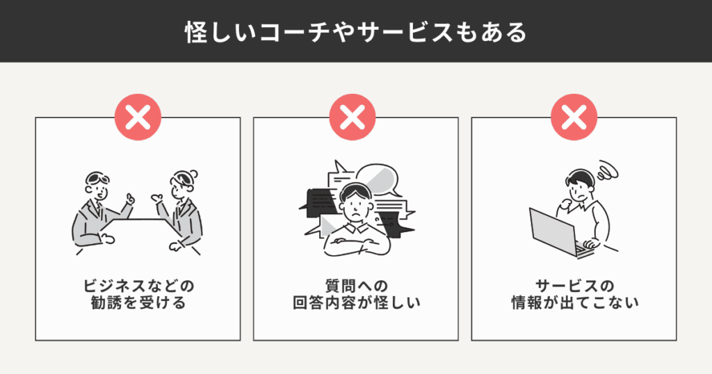また、以下のようなコーチやサービスも怪しいので気をつけましょう。