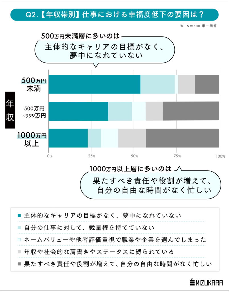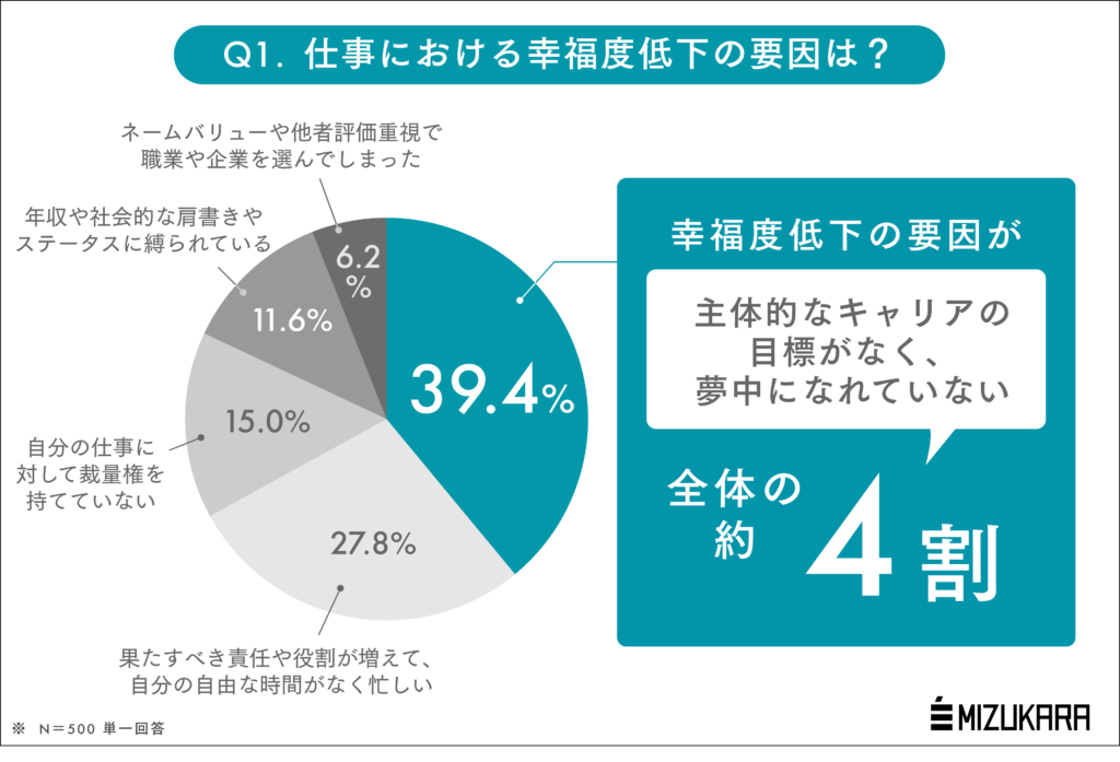 認知科学に基づくコーチングを法人・個人に提供する株式会社ミズカラ(本社:東京都千代田区、代表取締役 山宮健太朗)は、このたび25歳~59歳の働く男女500名を対象とした「仕事における幸福度低下の原因」に関する意識・実態調査を行いました。