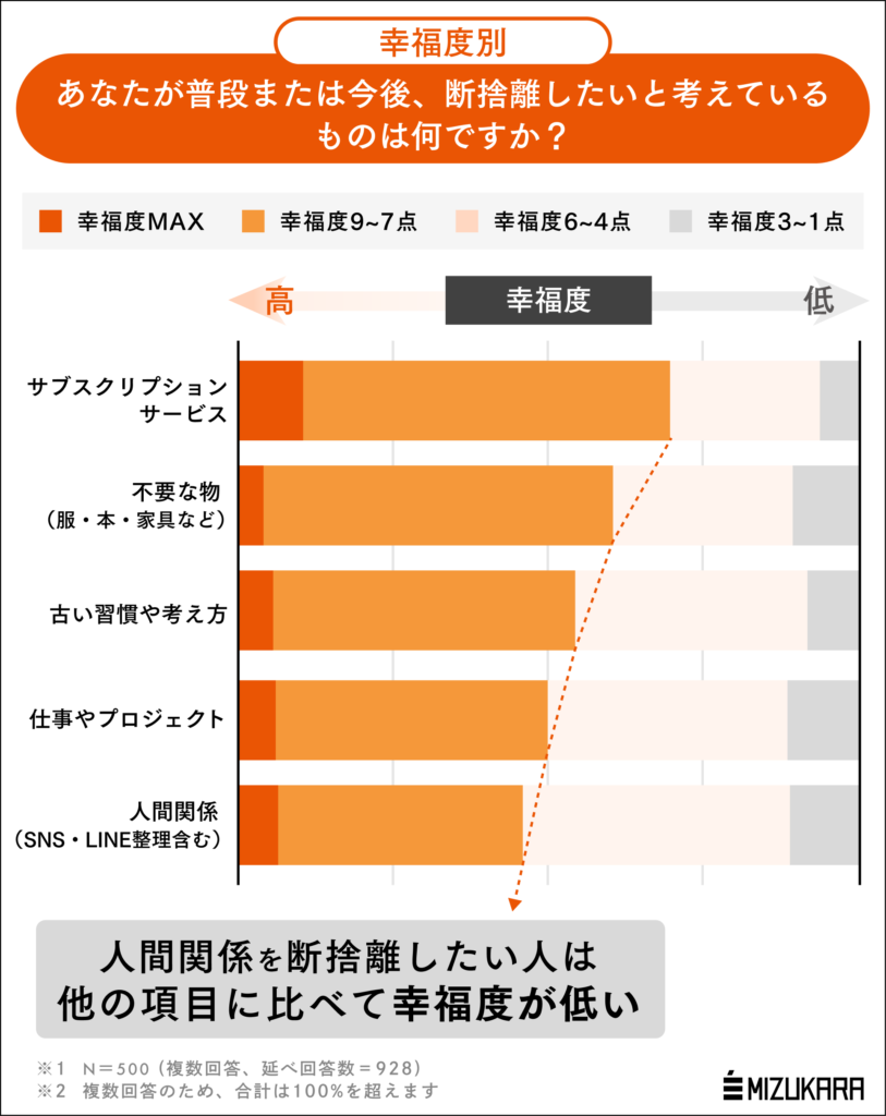人間関係を断捨離したいと考える人は、現在の幸福度が低い