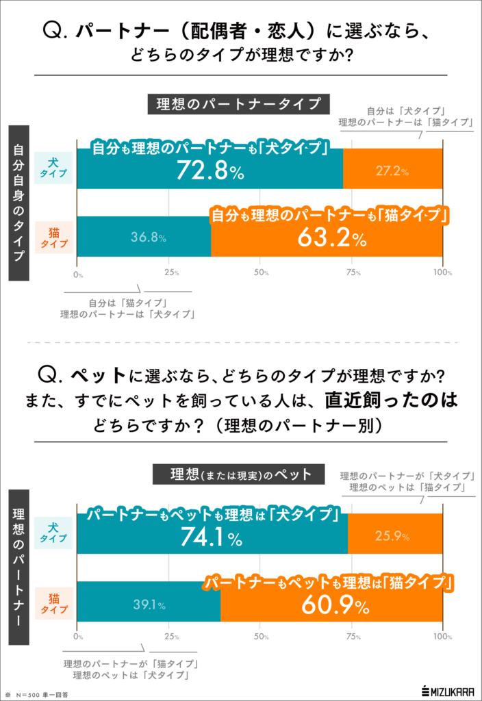 調査の結果「猫タイプ/犬タイプ」の自意識は男女ともに概ね50%ずつで、女性=猫っぽいなどのイメージは現実の自己認識とは一致しないことが判明。また約7割がパートナー・ペットにも同タイプを求める傾向も