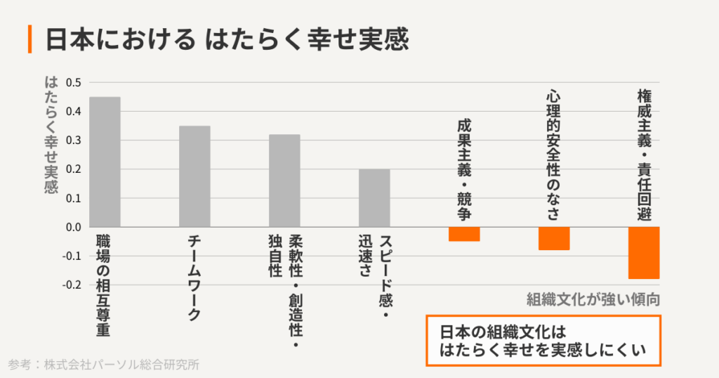 「権威主義・責任回避」とは、「上層部の意見や指示にはとりあえず従う」「社内では波風を立てない」といった、日本企業の特徴ともいえる組織文化のことだ。物事の決定に自己の判断がない=自己の存在がないのだ。「権威主義・責任回避」が強いほど、仕事への幸福度が下がる関係にある。それとは反対に「職場の相互尊重」がはたらく幸せ実感が高い関係にある。