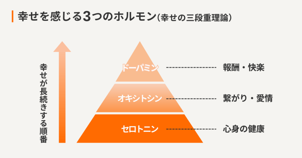 人間が幸せを感じるためには、この3つのホルモンを満たす必要がある。「セロトニン→オキシトシン→ドーパミン」の順番に満たし、積み上げることで幸せと感じる状態が長続きしやすい。この原理原則を『幸せの三段重理論』と呼ぶ。心と体の健康が全ての幸せの土台であり、人との繋がりがなければいくら成功しても幸せが長続きしないのである。