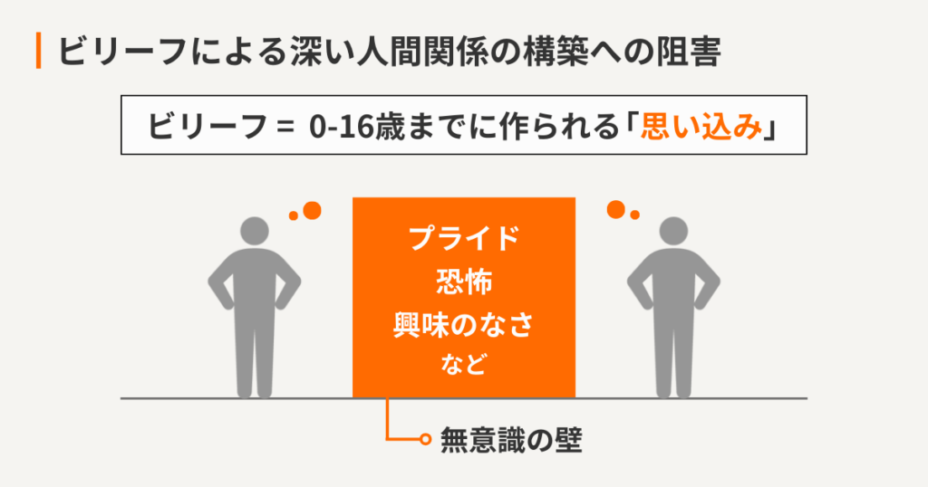 仕事で深い人間関係を構築するには、ビリーフから解放されることが重要である。ビリーフとは、0~16歳までに作られる「思い込み」のことである。「人に弱みを見せられない」「成果を出せなければ価値がない」「人に興味がない」「人の目を見て話せない」「カッコつける」「強がる」「プライドが高く自分を守る」「いつも周りより劣っている」「目上の人が怖い」「人に深く関わることが嫌い」など無意識の思考を、自分の中の思い込みとして作り上げる。これらの思い込みが深い人間関係の構築を阻害している。ありのままの自分と相手を受け入れて、強固な信頼関係を築けば、深い人間関係を構築することができ、仕事を通して幸福を感じるはずだ。