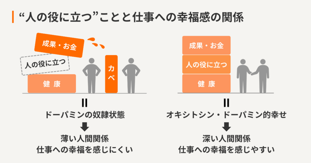 仕事を通して幸せになりたいのなら、お金を稼ぐことや成果を求めることも重要であるが、「人の役に立つ=オキシトシン的幸せ」を追求することが重要である。深い人間関係を築きながら『社内/社外問わず人の役に立つ』という実感を覚えながら仕事をすることで、オキシトシンが分泌され幸福を感じられるからだ。