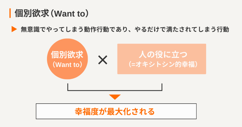個別欲求(Want to)とは、無意識でやってしまう動作行動であり、やるだけで満たされてしまう行動のことである。そのため、個別欲求(Want to)を満たす仕事ができれば、仕事の動作行動そのものが満たされるものとなり、お金、役職、成果に依存しない幸福に繋がる。そのうえで「人の役に立つ」実感を手にすることで、キシトシンも満たされていく。