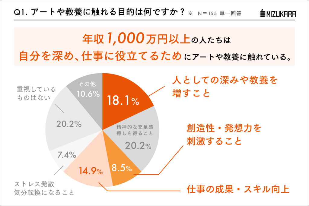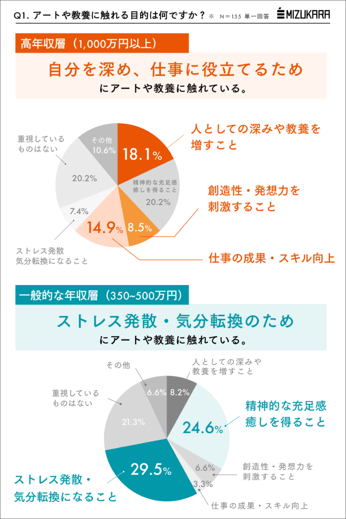 年収1000万円超の人がアート・教養に触れる理由として特徴的なのは人としての深みや教養を増し(18.1%)、さらに仕事の成果にもつなげたい(14.9%)という回答。一方で一般的な年収層(350-500万円)では約3割がストレス発散や気分転換のためと答えました。同じ鑑賞でも見る視点が変わってくると、そこから学べる収穫量も変わるということでしょうか。この秋は少し意識を変えて実りの多い秋にしたいものですね。