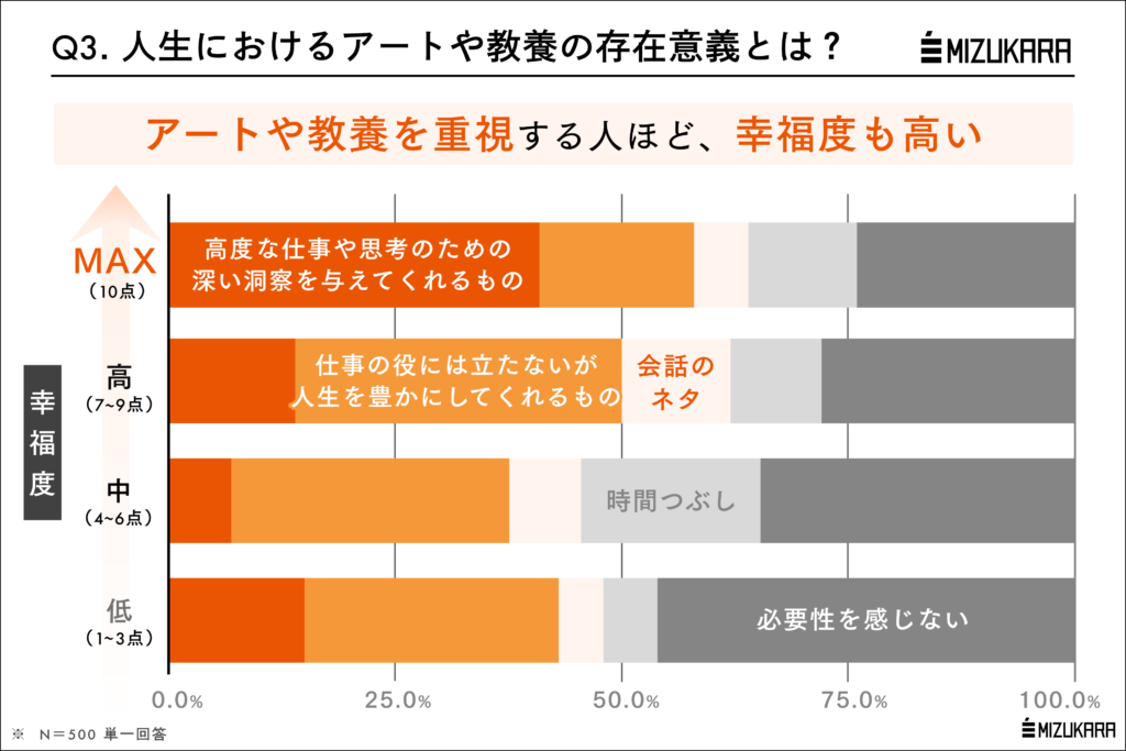 冒頭の調査では、年収帯に関わらず「精神的な充足・癒しを得る」ためにアートや教養に触れるという人も多く見られました(20-25%)。では実際、アートや教養は人生の豊かさに影響しているのでしょうか?そこで、同時に調査で質問していた「幸福度」との相関を探ってみたところ、幸福度が高い人ほど人生の中でアートを重要視している傾向が明らかになりました。
