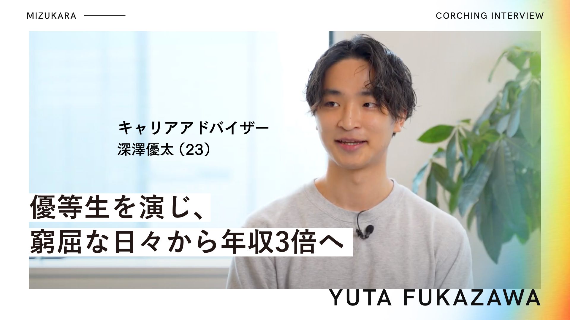 深澤優太と申します。年齢は23歳で、人材業界領域で転職支援を行っています。主な変化としては、1年目から2年目で売上が3倍、年収は330万円だったところから現在720万円まで変化することができました。
