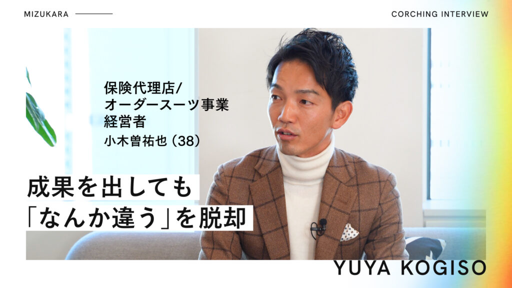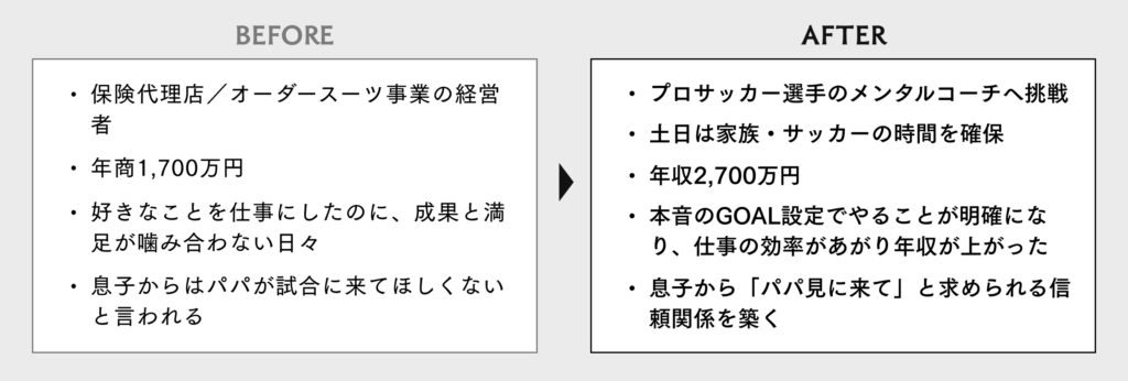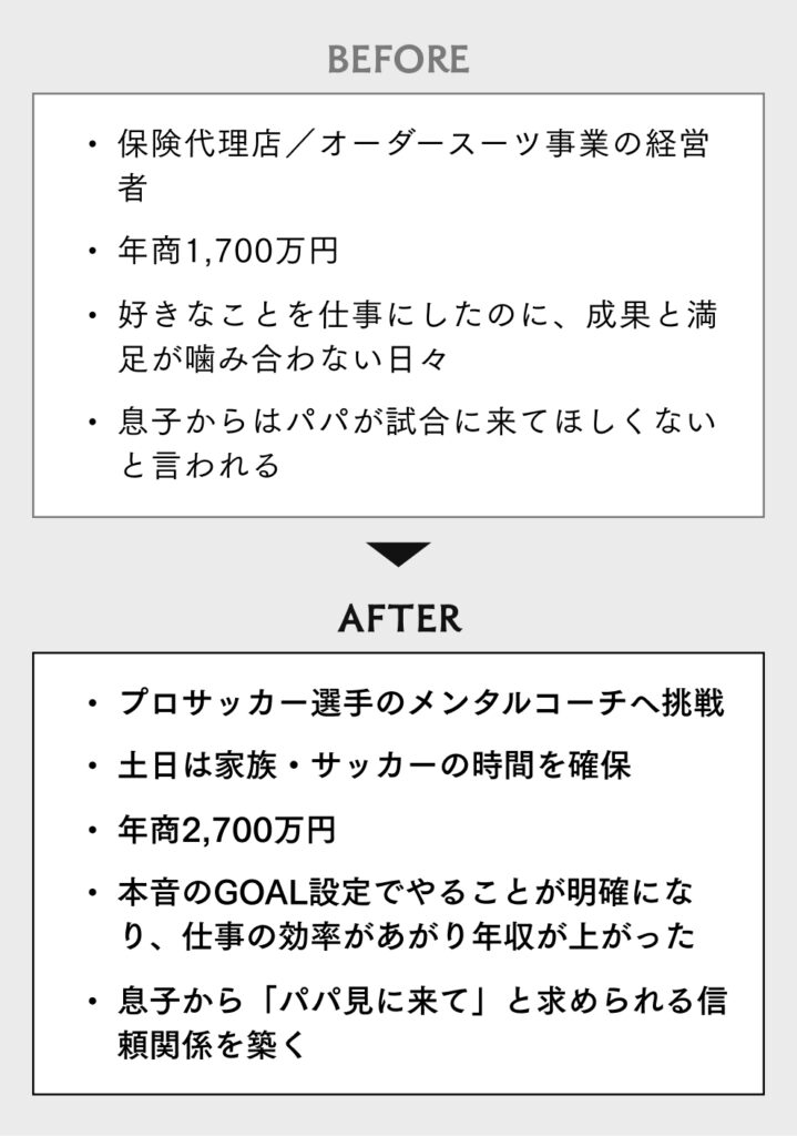 保険代理店の代表として独立し、さらにオーダースーツ事業まで展開する小木曽さん。外から見れば申し分ない成功を収めているように見える彼が、土日も働き詰めで「なんかモヤモヤしてよくわからない」状態から脱却し、子どものサッカー指導という本音のGOALを発見。