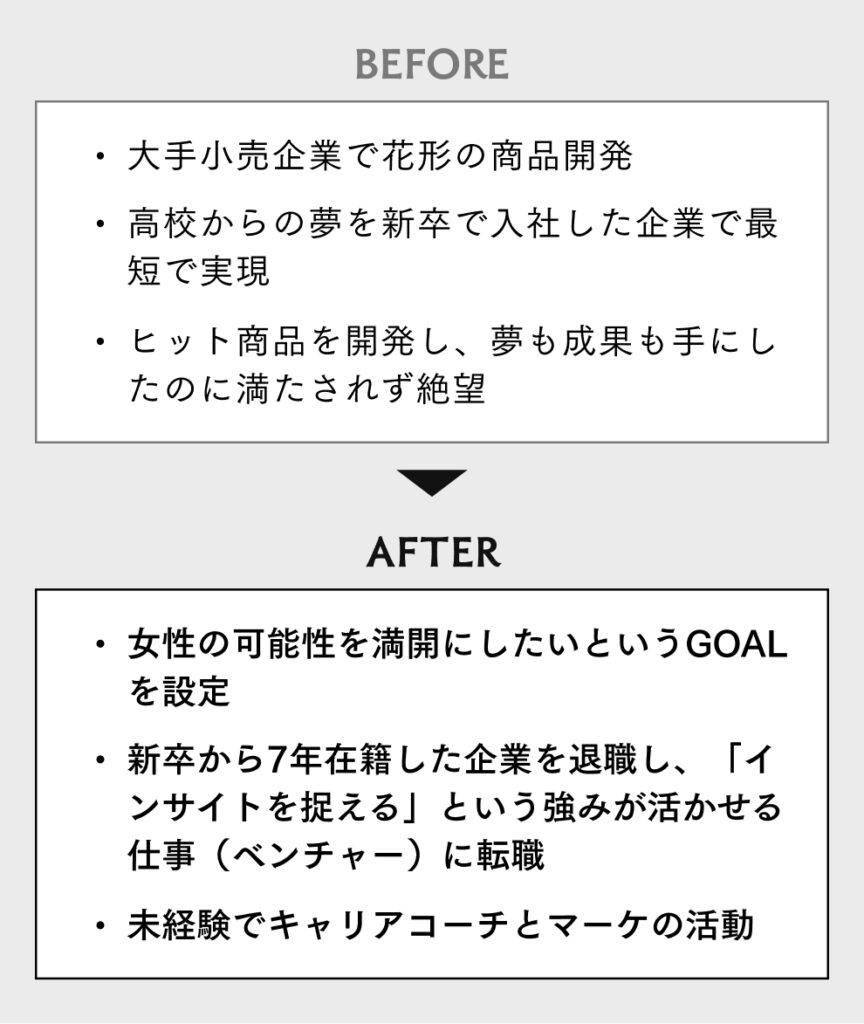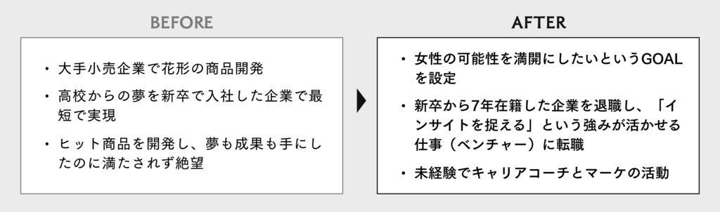 GOALから見た時に「今の職場でこれってできますか?」ってコーチから聞かれた時に「できないな」っていうのが明らかになって。本当にこれを獲得したいって思ってたので、「これを手放すしかない」って思いました。